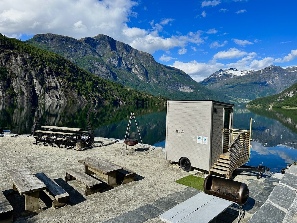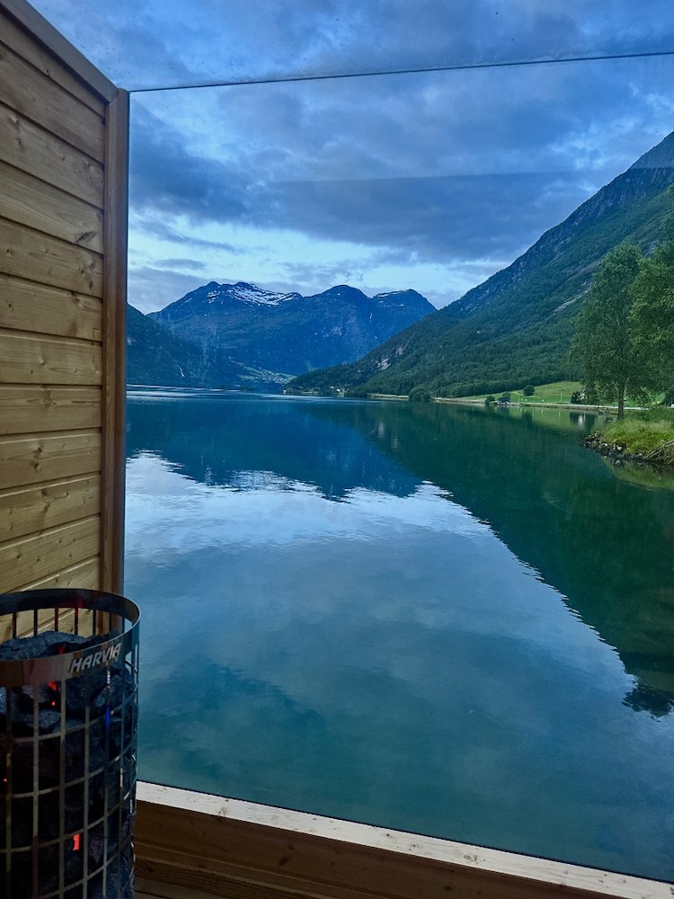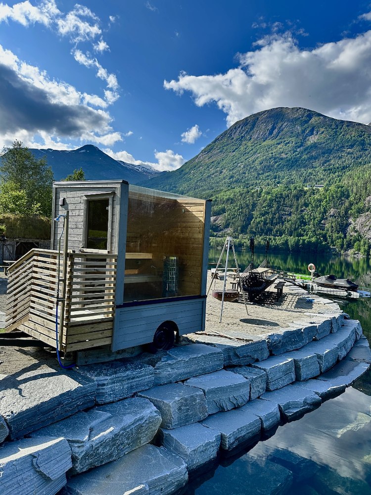 Flott panoramasauna som er plassert nede ved vår private fjære. Opplev det vakre landskapet og ta deg et forfriskende bad i sjøen. Saunaen har plass til opptil 6 personer, men er ideell for 3 for best komfort.